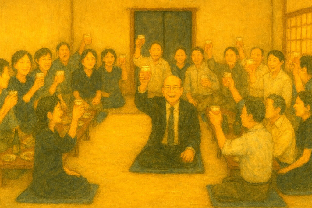 広い座敷ではもう座が沸き立っていて、畳敷きの部屋の中央にざっと見ても十人ばかりの人が坐って彼女たちを迎えた。朱海はただただ圧倒されて、紹介される一人ひとりに機械的に頭を下げていたので、誰が誰なのかさっぱり分からないまま、気が付いたら皆と同じように青い座布団に坐らされていた。清々しい和服に黒い帯をした老人がこの家の主らしい。他に背広姿の二十代と三十代の男性が二人、座を明るく取り持っていた。上の方がさきほどの双子の女の子たちの親らしい。下の方は隣に坐っているOL風の女性と近々結婚すると紹介された。幼稚園児位の女の子と、後は中学生の男女がそれぞれ母親らしい人の側に坐って居たが、どちらが誰の子であるのか、二人とも同じ親の子供かまったく分からなかった。